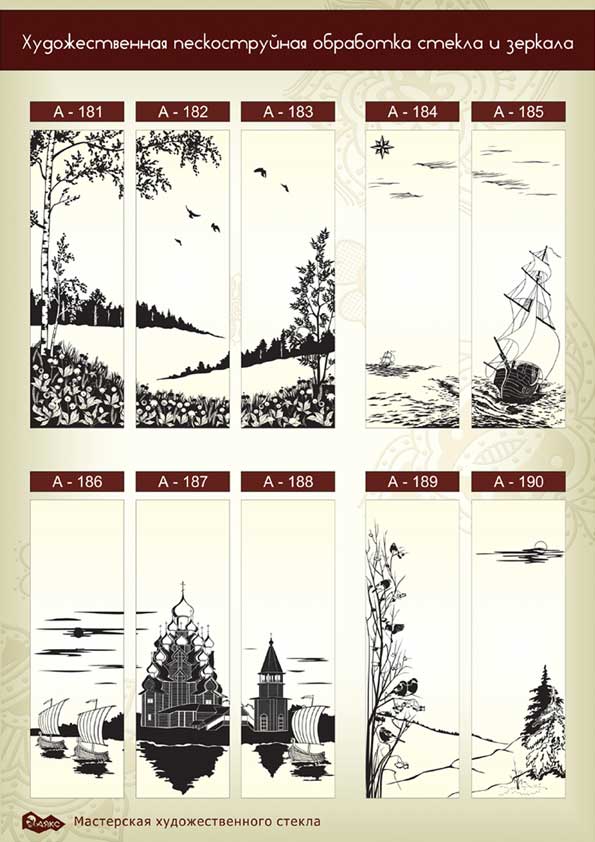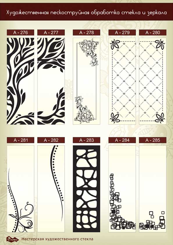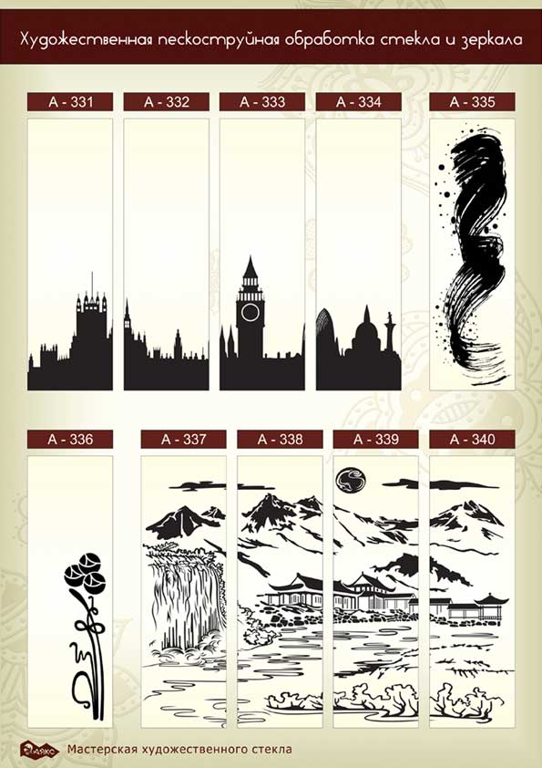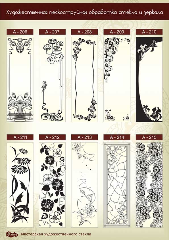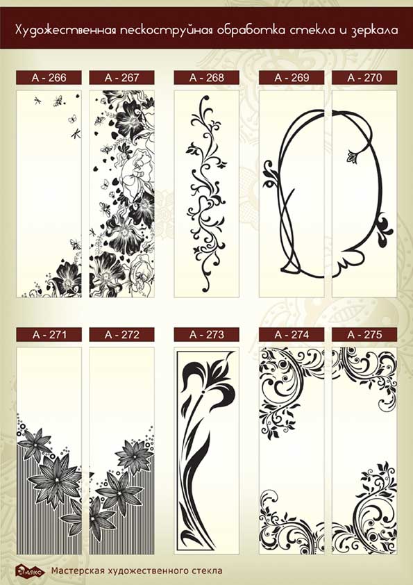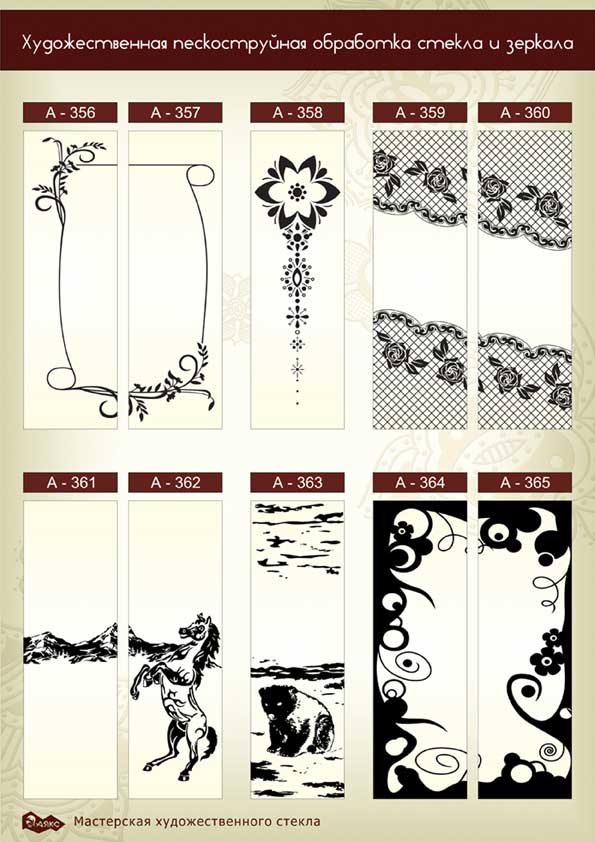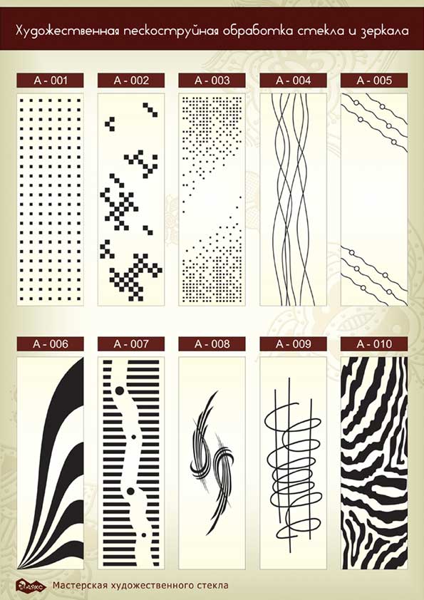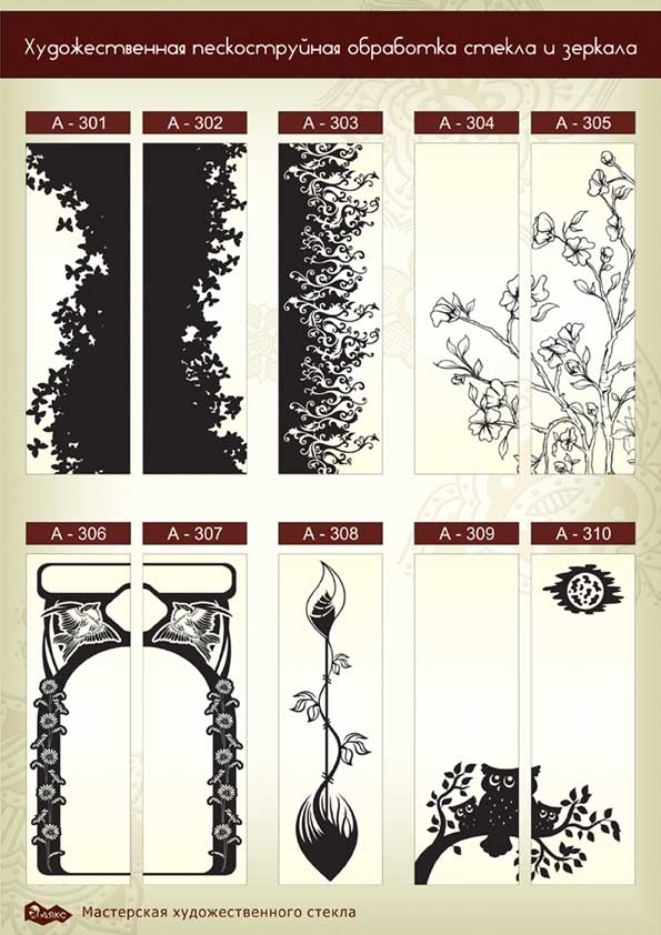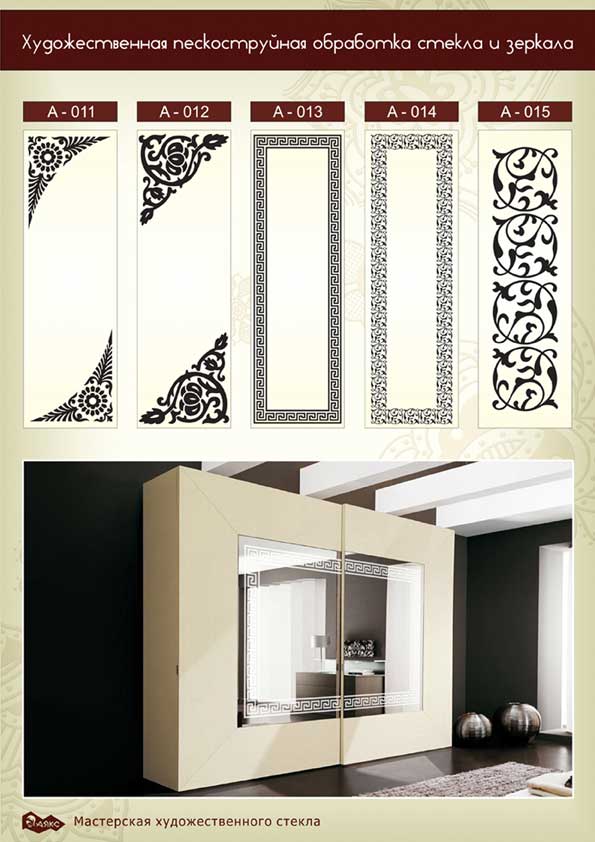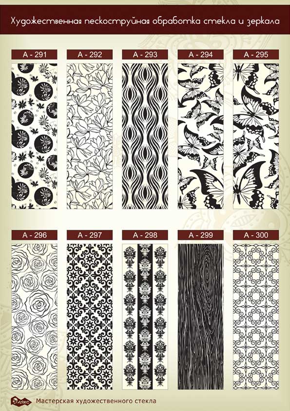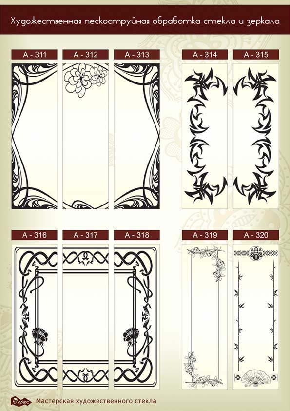 Стекольная мастерская в Санкт-Петербурге выполняет пескоструйную обработку стекла и зеркал на современном оборудовании. Наносим матовые рисунки, узоры, полосы и декоративные элементы по готовым макетам или индивидуальным эскизам.
