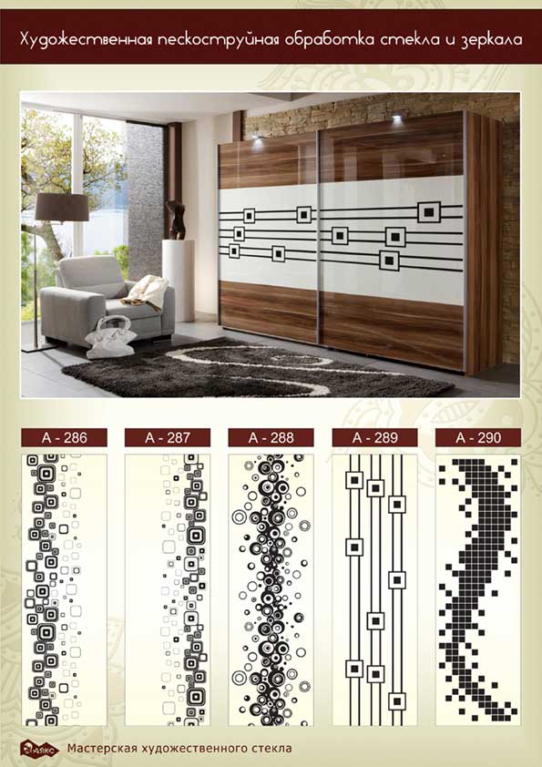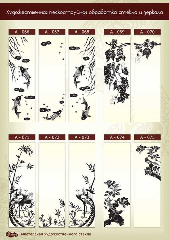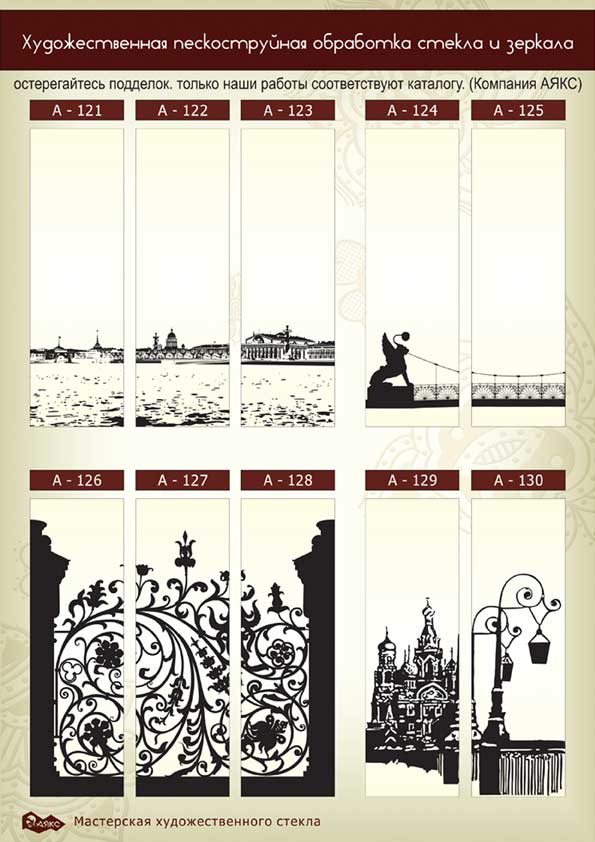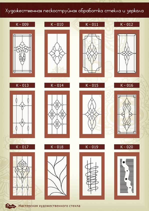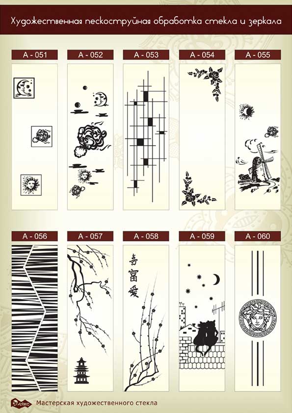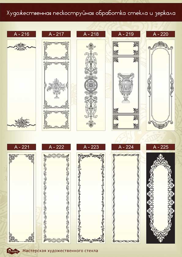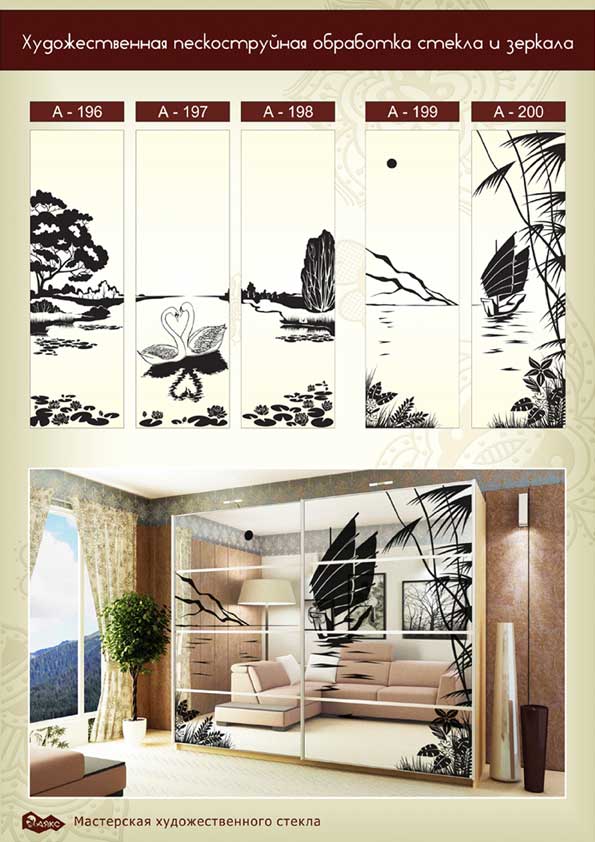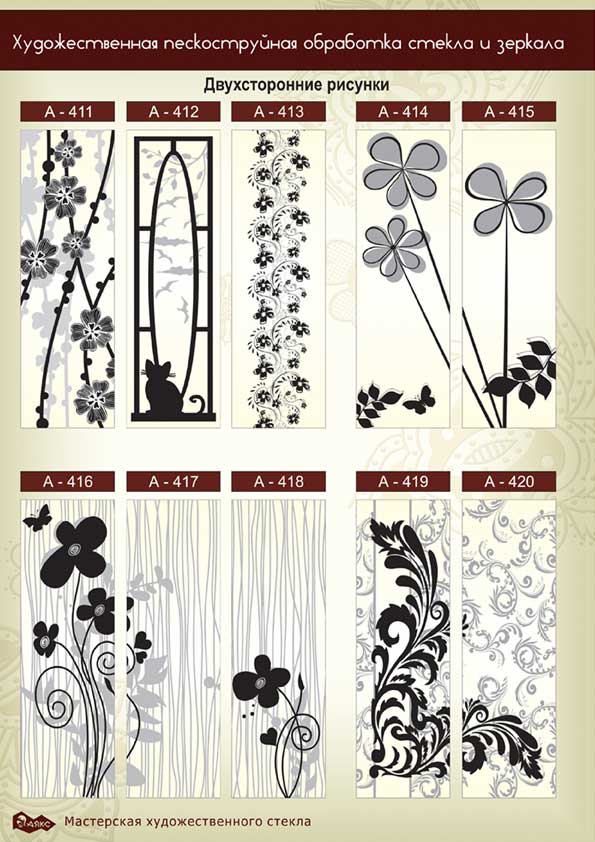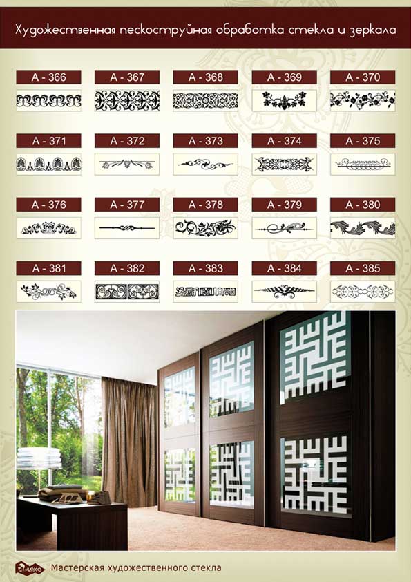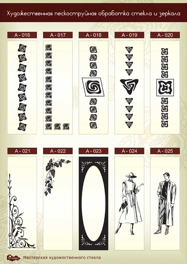 Стекольная мастерская в Санкт-Петербурге выполняет пескоструйную обработку стекла и зеркал на современном оборудовании. Наносим матовые рисунки, узоры, полосы и декоративные элементы по готовым макетам или индивидуальным эскизам.