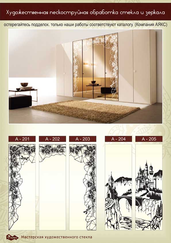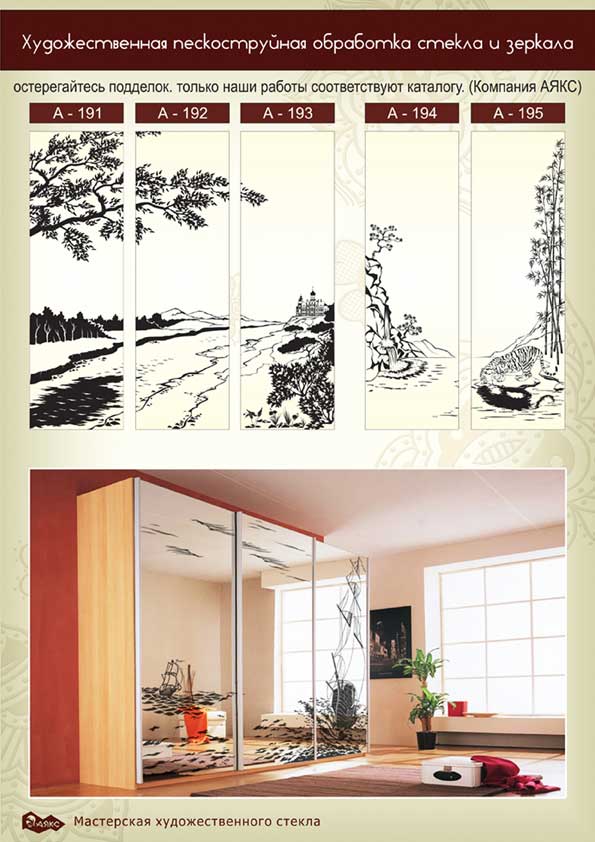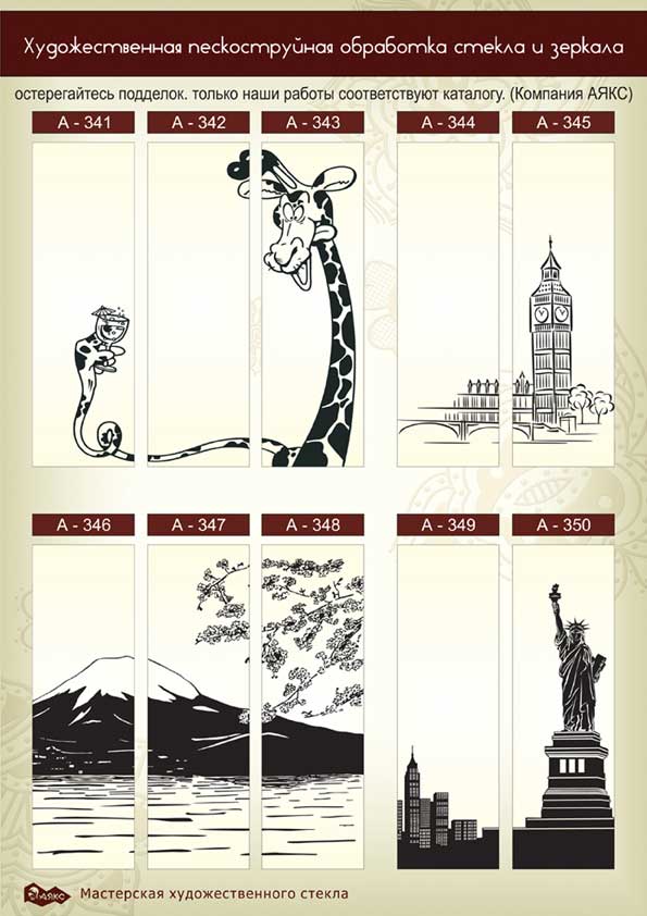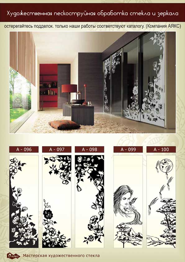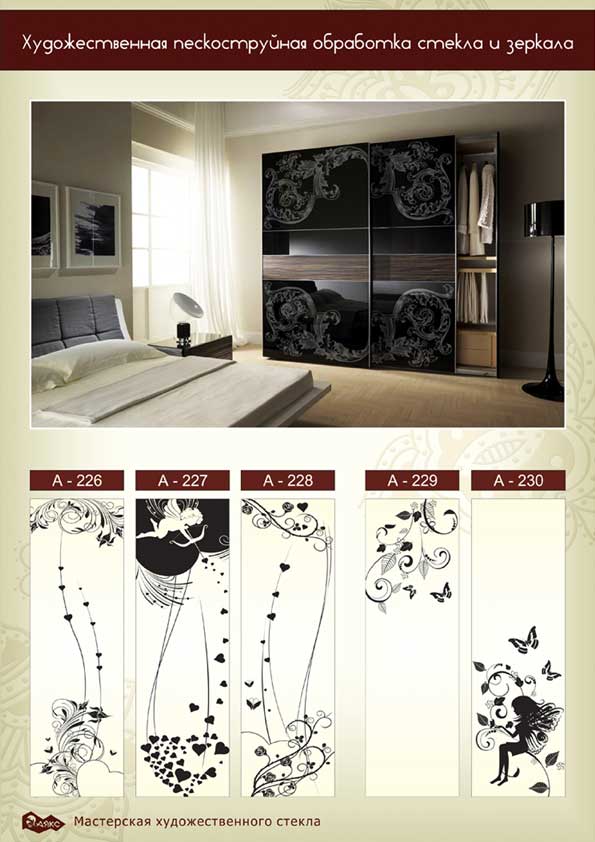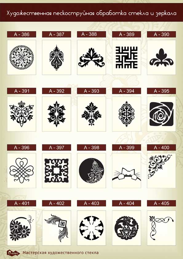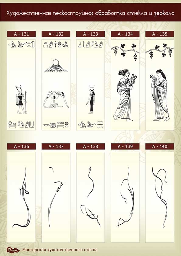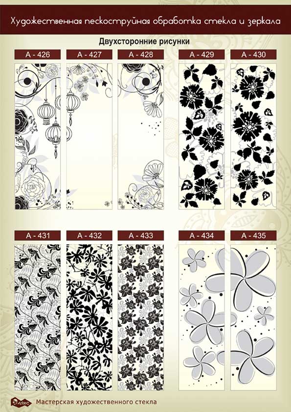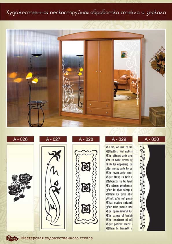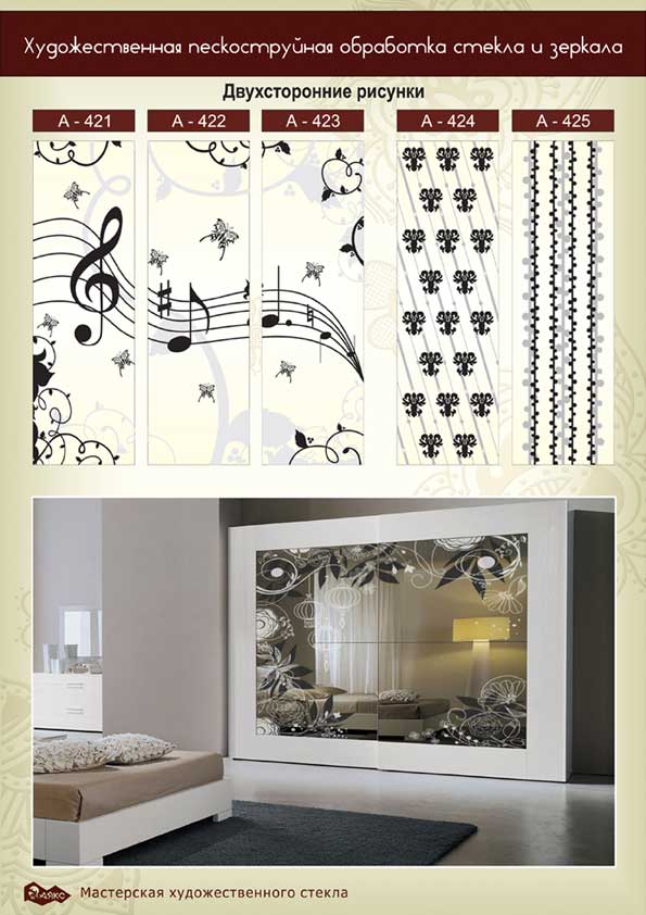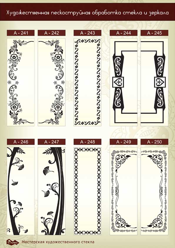 Стекольная мастерская в Санкт-Петербурге выполняет пескоструйную обработку стекла и зеркал на современном оборудовании. Наносим матовые рисунки, узоры, полосы и декоративные элементы по готовым макетам или индивидуальным эскизам.